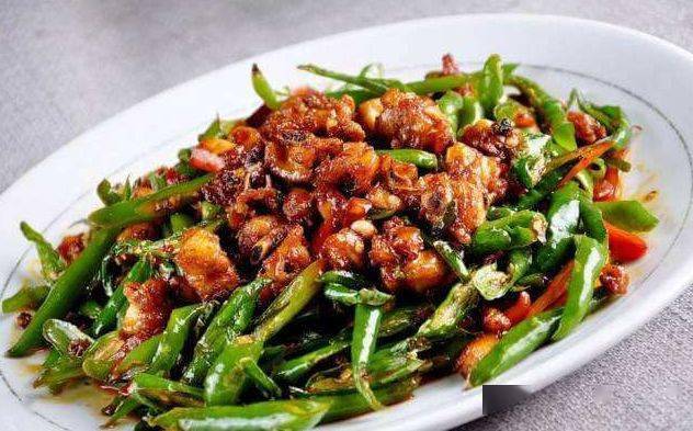 3、鍋留底油燒至四成熱,下干辣椒段10克、蒜片5克爆香,下入自制香辣醬15克煸出香味,加生抽5克、龍牌醬油3克、雞精、味精各2克調(diào)味,倒入所有拉油的原料翻勻,撒炸花生米及芝麻出鍋即可。
