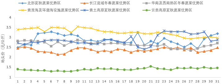 二是各主產(chǎn)區(qū)差異明顯。從價格水平看,黃淮海與環(huán)渤海設(shè)施蔬菜優(yōu)勢區(qū)平均地頭價3.26元/公斤,明顯高于其他優(yōu)勢區(qū),主要原因是設(shè)施生產(chǎn)以價位相對較高的茄果類蔬菜為主。云貴高原夏秋蔬菜優(yōu)勢區(qū)平均地頭價1.40元/公斤,明顯低于其他優(yōu)勢區(qū),主要原因是本地區(qū)多以葉菜為主,價格相對較低。從月內(nèi)走勢看,云貴高原夏秋蔬菜優(yōu)勢區(qū)、長江流域冬春蔬菜優(yōu)勢區(qū)、黃淮海與環(huán)渤海設(shè)施蔬菜優(yōu)勢區(qū)、華南與西南熱區(qū)冬春蔬菜優(yōu)勢區(qū)等4個優(yōu)勢區(qū)蔬菜平均地頭價走勢平穩(wěn),黃土高原夏秋蔬菜優(yōu)勢區(qū)、北部夏秋蔬菜優(yōu)勢區(qū)等2區(qū)波動較大,主要原因是夏季蔬菜上市初期的上市量不穩(wěn)定,所以價格波動比較大。